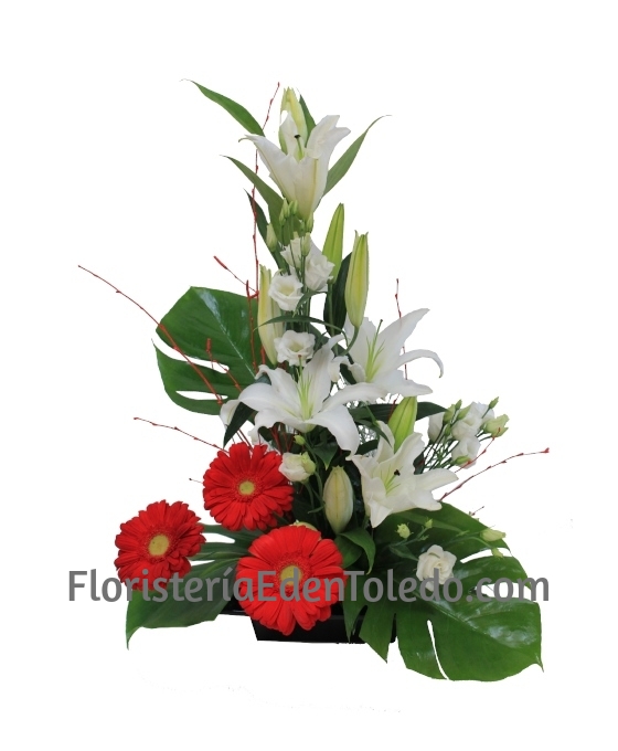 Especial, elegante es este Centro Flores Rabat. Es un centro de flores de regalo de diseño, luminoso y sobrio. Compuesto por bonitas flores como el Lilium Oriental, lisianthums, gerberas y todo ello decorado con verdes elegantes. En Floristería Edén Arte Floral, su floristería online, podemos ayudarle a hacer el regalo perfecto. Haremos llegar a su ser querido, todo el amor y alegría que quiere demostrar con este bonito centro de flores a domicilio. Sin duda, lo que quiere es hacer el mejor regalo. Desde nuestra floristería online hacemos envíos urgentes con la compra de cualquier centro de flores para regalar.